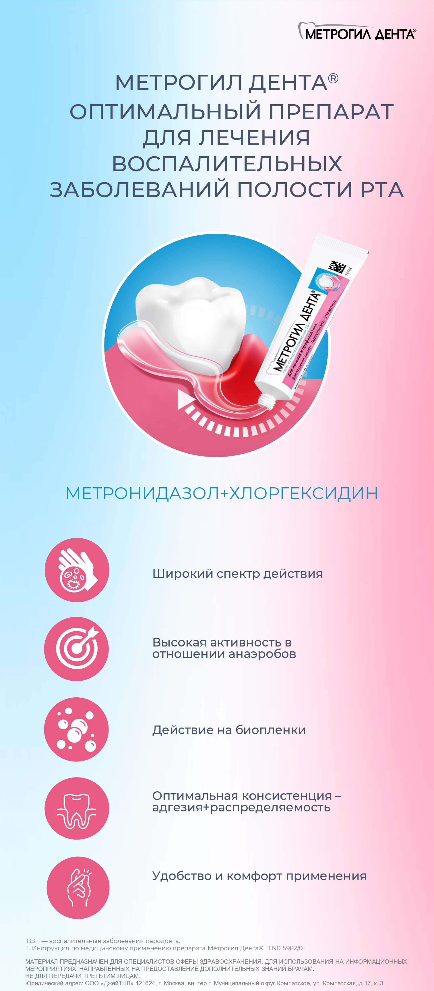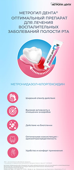 Особенный интерес вызывают препараты, которые не вызывают привыкания и применение которых не приводит к появлению резистентных штаммов микроогранизмов. Метрогил Дента — уникальный препарат с гелевой формой, содержащий оптимальную комбинацию противомикробного препарата и антисептика широко спектра действия. Почему он так эффективен в пародонтологии и в каких еще случаях стоматолог без него не обойдется — в цикле наших вебинаров.